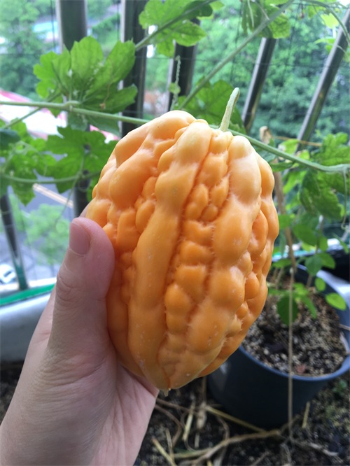 因为是一年生植物,想要继续年年有瓜可吃就必须自己留种子。像这样,白玉苦瓜变色成为橙色苦瓜,里面的种子就成熟了。自己留种,可以像丝瓜一样,每年春天再播种,又是可持续的一种瓜类食物呀!ONELiving 一活生态阳台版权所有!