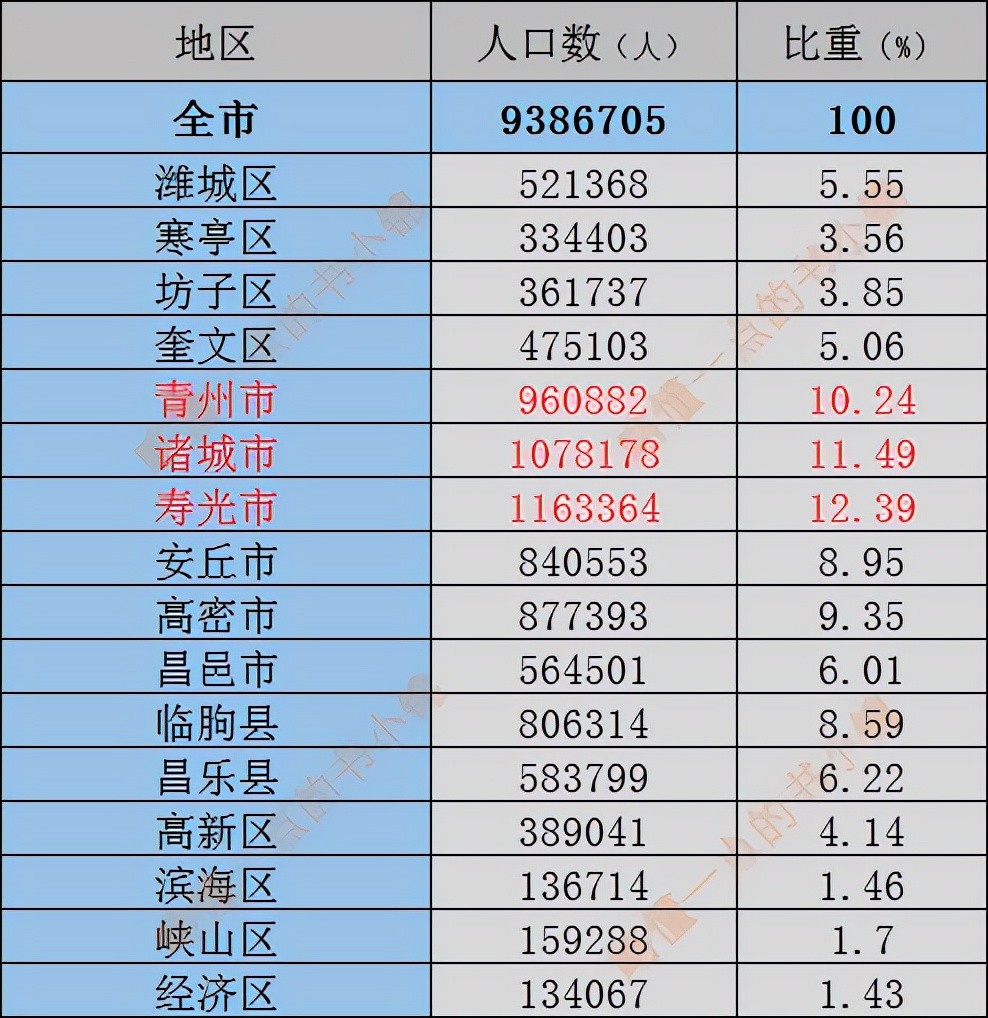 潍坊市各区县市人口占比情况