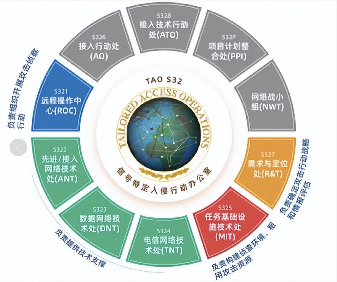 直接参与指挥与行动的主要包括TAO负责人罗伯特•乔伊斯,远程操作中心(主要负责操作武器平台和工具进入并控制目标系统或网络)以及任务基础设施技术处(负责开发与建立网络基础设施和安全监控平台,用于构建攻击行动网络环境与匿名网络)。