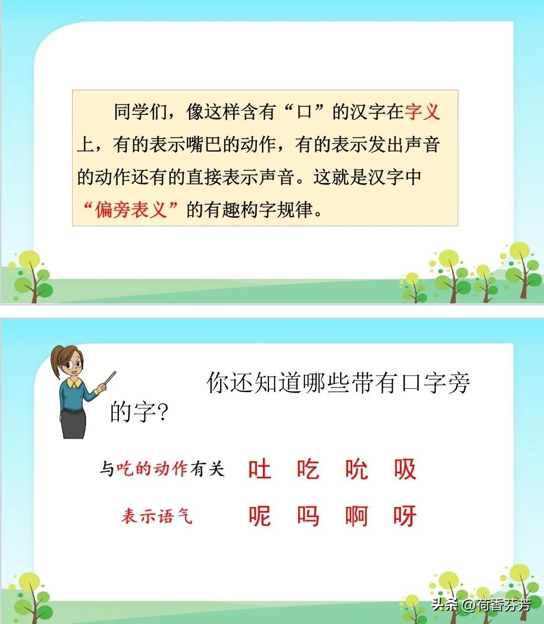 这些生字都与我们的嘴巴有关,这就是汉字中“偏旁表义”的构字规律。