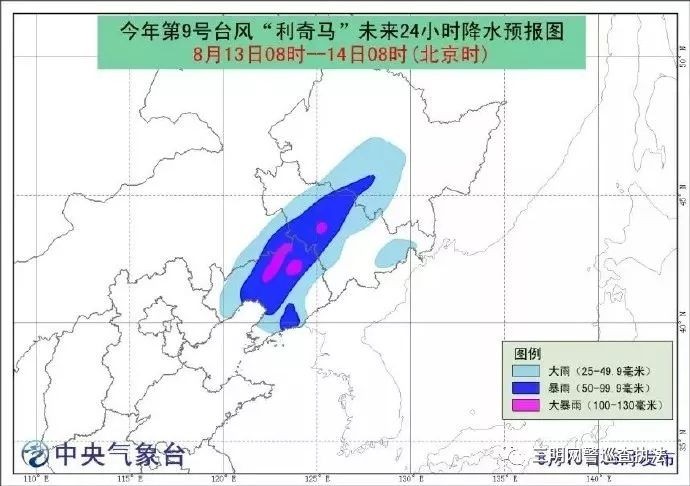 中国天气网讯 中央气象台8月13日06时继续发布台风蓝色预警:今年第9号台风“利奇马”(热带风暴级)的中心今天(13日)早晨5点钟位于山东省潍坊市北部近海海面。预计,“利奇马”逐渐向北偏东方向移动,移动速度逐渐加快,向辽宁南部沿海靠近,强度逐渐减弱。黄海中部和北部、渤海海峡、渤海以及山东半岛、辽宁、河北和天津等地沿海将有6-7级大风。其中辽宁西部、吉林中部、内蒙古东南部等地局地有大暴雨。#台风利奇马#@应急管理部