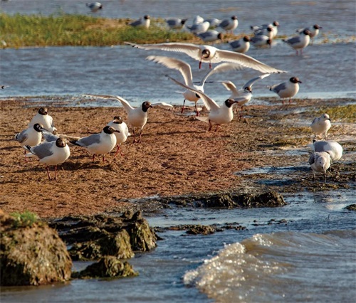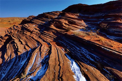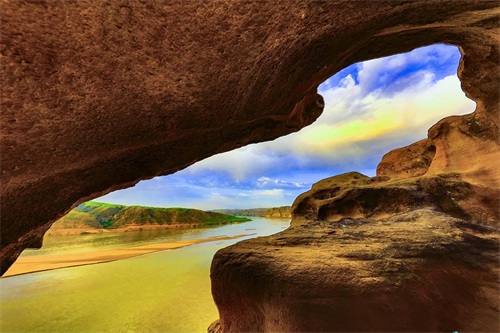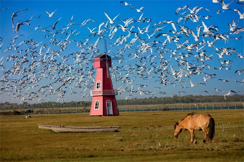 第二,色彩丰富而典雅。自然界和人类社会五彩缤纷,充满了无限丰富和不断变化的色彩。不同的色彩能给人以心理上不同的感受,激发人们的情感共鸣。如暖色给人以温暖、温馨的感觉,冷色使人产生理智、宁静的联想等等。马夫先生特别善于运用色彩来表达他的光影理念,如捕捉橙黄色的晚霞云彩和晚霞辉映下的橙黄色水面,表现黄土高原段的黄河;聚焦满地金黄的柿树落叶和一片橙红的树上红叶,展现丰收的金秋时节;特写青翠嫩绿的初春枣叶,讲述枣乡春天的故事;运用蓝绿相邻色,表现冬天的茫茫原野营造出北国冬季的安静平和等等。他还特别重视运用互补色的对比突出作品主题。如在府谷丹霞的拍摄中,大量运用近景丹霞的橙红色与远景群山的冷蓝色,形成冷暖色彩的对比,使画面更具视觉冲击力和美感。此外,他尤其重视同一幅画面各种色彩的协调和平衡。如表现“红碱淖”美丽风光的全景式图片,蓝天白云下,一望无际的金黄沙海里嵌入一位红裙飘飘的美丽少女,冷暖色彩相互平衡,给观者带来温暖和愉悦的快感,使画面呈现出一种神圣与美丽。