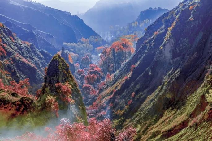 第三,层次清晰而富有质感。现实世界是三维立体的,而照片则是二维平面的。如何在二维平面上表现出三维立体的空间感和丰富层次,是马夫摄影非常注重的一个关键环节。一是借助拍摄对象近大远小的透视变化进行创作。如拍摄神木老城的街巷,他巧妙地运用道路的纵深感引导观者的视角由近及远,使照片的层次感突显出来。特殊情况下,他还会利用景物本身有规律的线条形成透视,使画面表现出三维空间效果。二是拍摄时充分利用前景。如景陵平视图的创作,就是将陵前石雕作为前景,景陵所在的群山变为中景,天边的云彩和万里晴空成为远景,画面视线向前延伸,立体空间氛围增强,层次变得非常丰富。三是选择明暗对比较大的区域作为拍摄背景,而将拍摄对象安排在明暗交界区域,强烈的画面明暗反差,由近及远递进的明暗关系,使观者产生非凡的空间立体体验。四是巧用色彩。将颜色差别明显的景物同时纳入画面,利用强烈的对比效果,增强照片的层次感,展示丰富的画面内容。《丹霞丹青》的拍摄大量地运用了这种方法。此外,调整曝光组合、巧妙选取角度、加强虚实对比、使用浅景深等等,都是他熟练运用的方法。