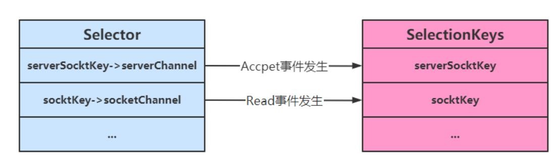 当调用了 server.register (selector, SelectionKey.OP_ACCEPT) 后,Selector 中维护了一个集合,用于存放 SelectionKey 以及其对应的通道// WindowsSelectorImpl 中的 SelectionKeyImpl数组private SelectionKeyImpl[] channelArray = new SelectionKeyImpl[8];public class SelectionKeyImpl extends AbstractSelectionKey { // Key对应的通道 final SelChImpl channel; ...}