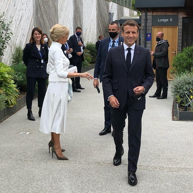 当地时间6月11日,法国第一夫人布里吉特·马克龙陪同丈夫出现在康沃尔郡,参加在那里举行的G7峰会。尽管68岁的前女教师已经多次和丈夫一起见过英国首相鲍里斯·约翰逊,不过和首相夫人-33岁的凯莉正式见面还是头一回。