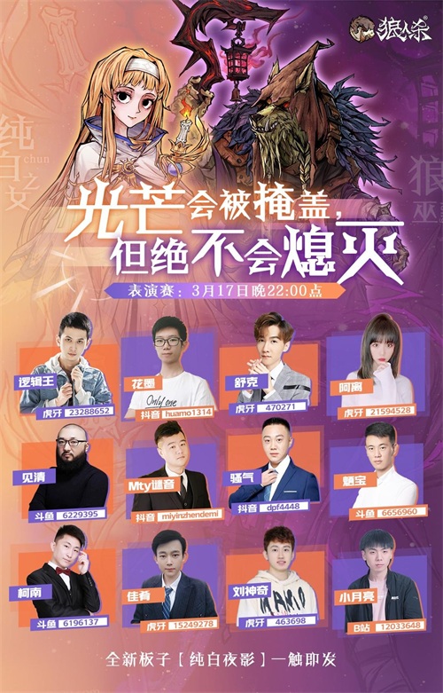 新板子该怎么玩?狼人杀特地邀请到了来自虎牙、斗鱼等多个直播平台的狼人杀主播为大家带来12人纯白夜影的趣味表演赛。3月17日晚上10点,主播们超前“体验”全新板子,纯白之女和狼巫究竟有着怎样的技能,主播们又会上演怎样的趣事?让我们拭目以待!