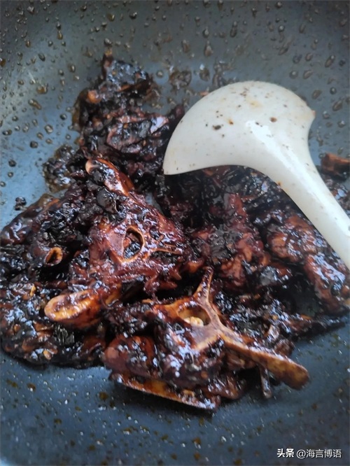 然后加入生抽,老抽入色,加白糖(或冰糖,味淡润肺)开小火炒粘稠,让糖融化为液体,汤汁成酱色后改大火,加入羊蝎子翻炒,多次翻炒后让羊蝎子着色,融入酱味。