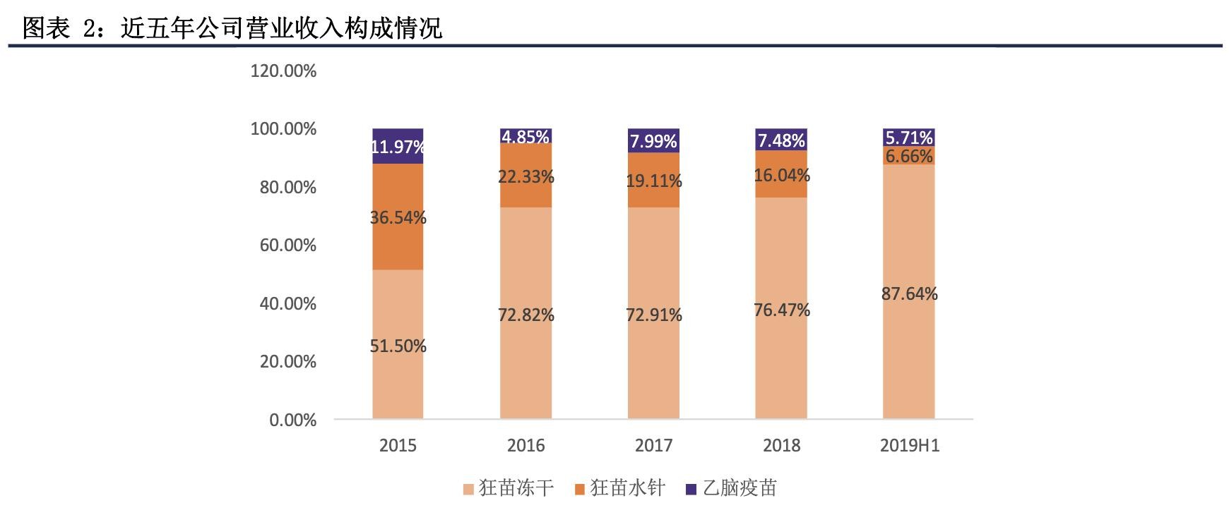 公司主营产品为人用狂犬病疫苗(Vero 细胞)与乙脑灭活疫苗(Vero细胞),其中狂犬疫苗具有水针和冻干两种剂型。冻干型狂犬病疫苗营收占比逐年提升,水针型狂犬病疫苗营收占比逐年降低。2019上半年,公司狂苗冻干、狂苗水针和乙脑疫苗营收占比分别为87.64%、6.66%和5.71%。