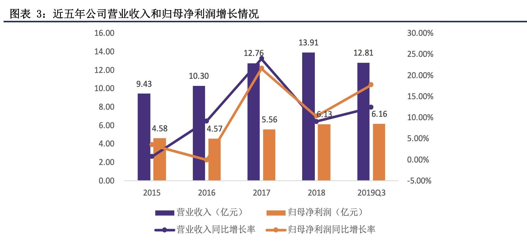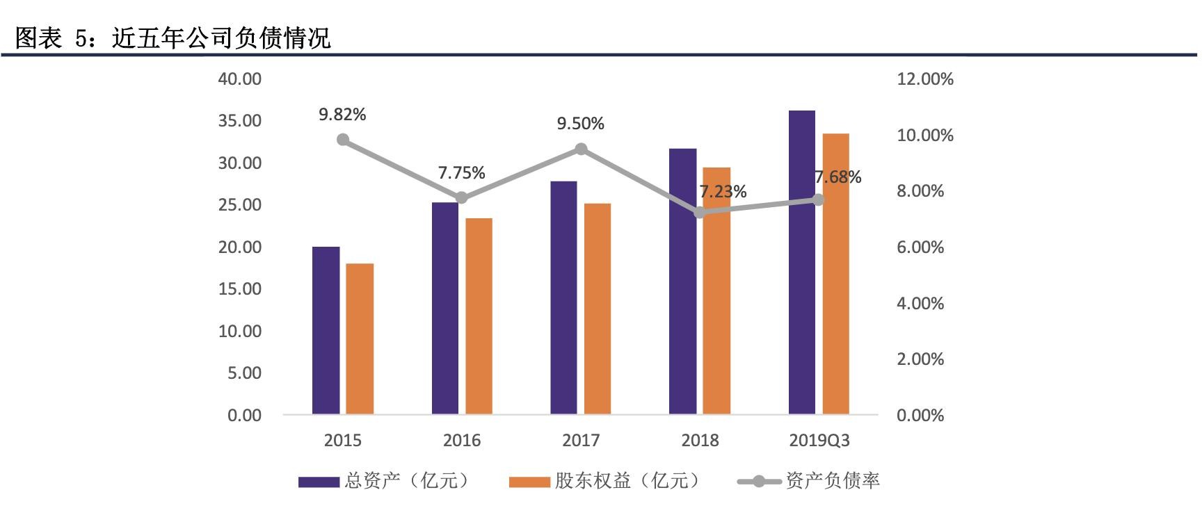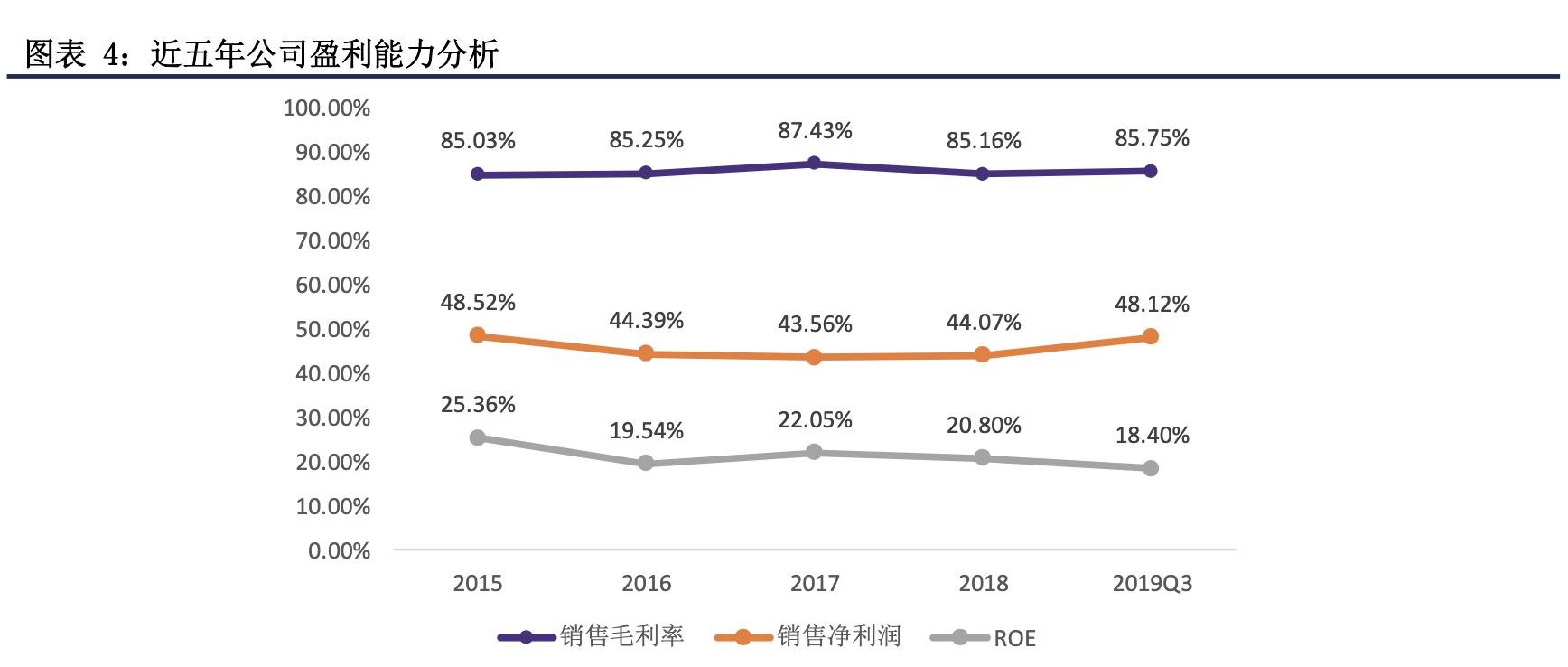 2015-2018年间,公司营业收入和归母净利润的复合增长率分别为13.83%和10.20%,2019Q3营业收入和归母净利润分别为12.81亿元和6.16亿元,整体增长较为稳健。近五年公司产品的销售毛利率基本维持稳定,2019Q3为85.75%,疫苗产品的毛利率较高。销售净利率和ROE水平整体较为稳定,2019Q3分别为48.12%和18.40%。总体来看,公司盈利能力较强。2019Q3公司总资产为36.28亿元,资产负债率为7.68%,资产负债率维持在较低水平。