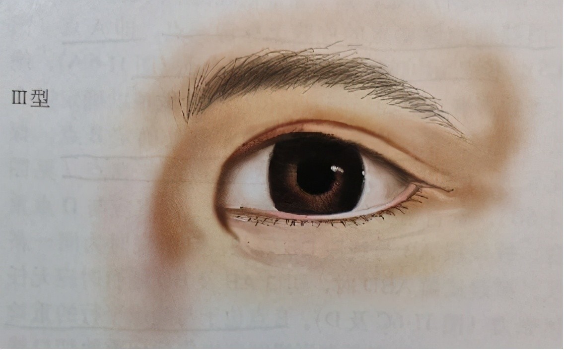 3、III型为泪湖几乎完全被内眦赘皮遮挡,且赘皮曲线侧方与下睑相接: