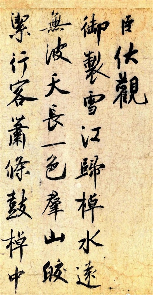 蔡京跋《赵佶雪江归棹图卷》 北京故宫博物院藏释文:臣伏观御制雪江归棹。水远无波,天长一色。群山皎洁,行客萧索。鼓棹中流,片帆天边,雪江归棹之意尽矣。天地四时之气,不同万物生天地间。随气所运,炎凉晦明,生息荣枯,飞走蠢动,变化无方。莫之能穷。
