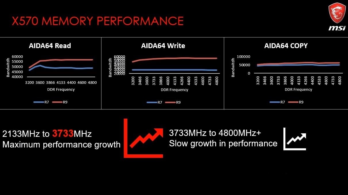 AMD内存分频是在Zen 2架构才加入的功能,该功能的加入解决了在Zen和Zen+在内存频率支持上的尴尬,根据微星的测试数据,我们可以看到在达到分频点之前,频率的提升带来的性能增长幅度是最可观的,超过这个点之后R7处理器的内存读性能反而下降了,其他有提升的部分,增长也很缓慢了。