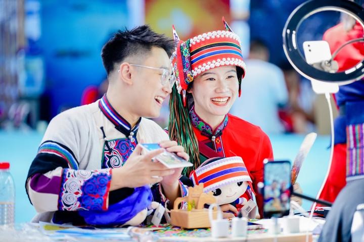 “现场的游客可以通过扫码进入‘石林风景名胜区’官方抖音直播间,来到线上与网友一起沉浸式云游石林,”展会现场穿着少数名族服饰的两位彝族主播,通过现场直播的形式,为在场游客沉浸式展示了石林地貌奇观和人文风俗。线上线下双屏的互动模式,加深了在场游客对了解石林和游历石林的浓厚兴趣,将氛围烘托的相当热闹,围观游客纷纷加入直播间,参与互动,连连点赞。