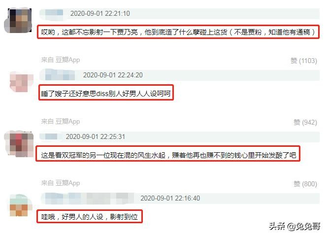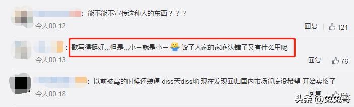 “睡了嫂子还好意思diss别人好男人人设呵呵”“这是看双冠军的另一位现在混得风生水起,赚着他再也赚不到的钱心里开始发酸了吧”“歌写得挺好的,但是小三就是小三,毁了人家的家庭认错了又有什么用呢?”