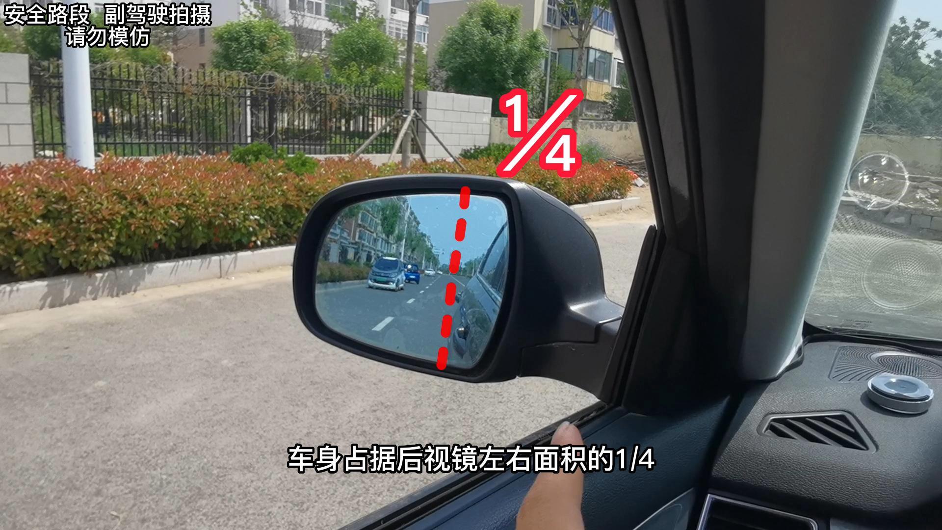 我们在调整好后视镜后,车身占据后视镜左右面积的¼,目的是我们在靠边停车时,能够看到车身距离路边的距离,而后视镜外侧的¾,目的是为了在车辆行驶中看到后方的路况,以防变道时和后方的车辆发生剐蹭。