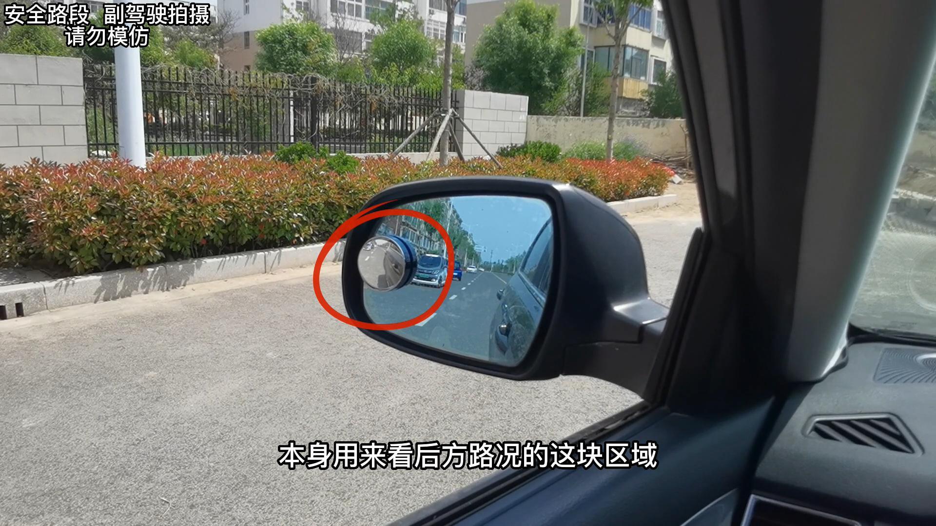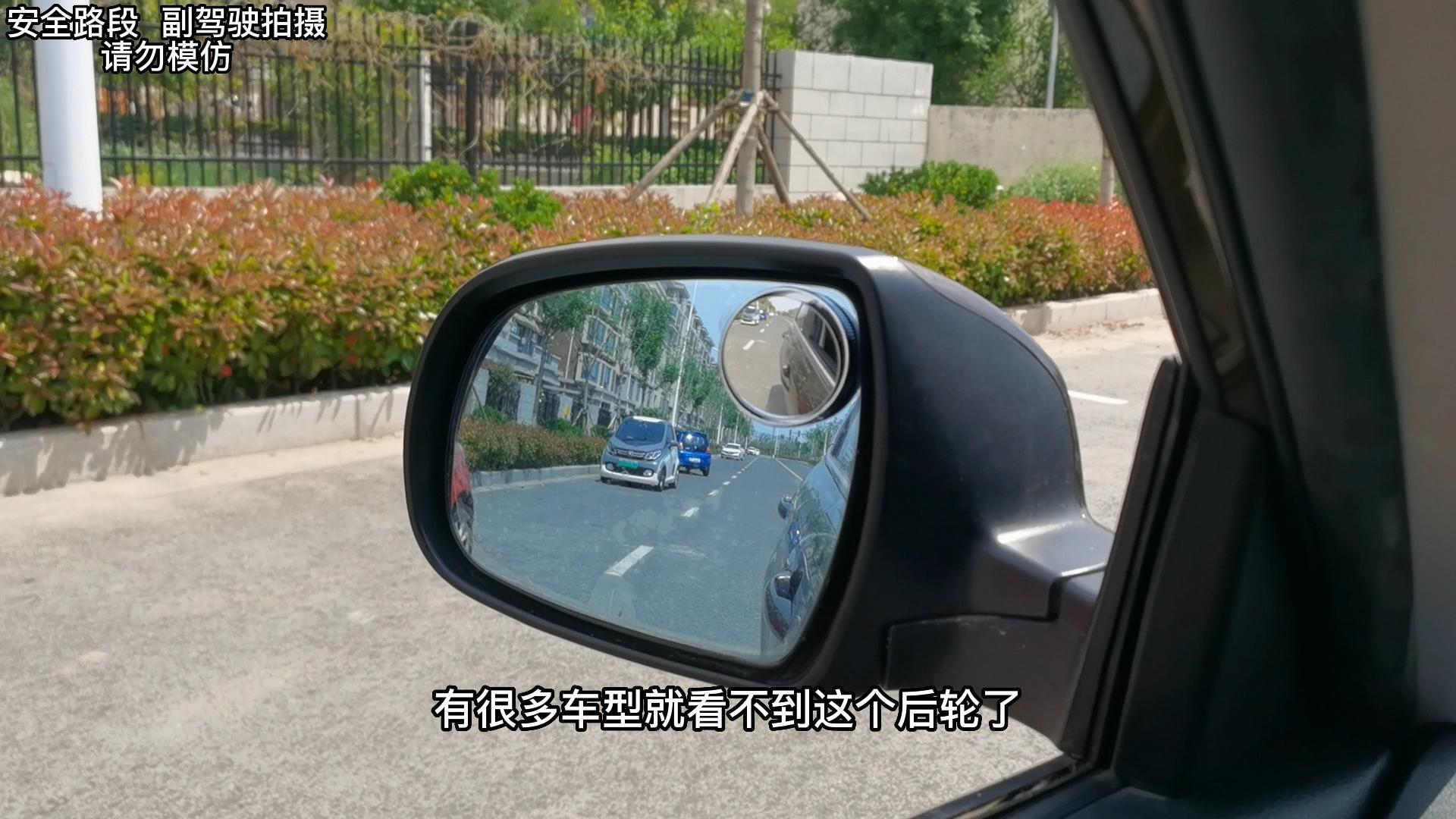 说实话,内侧上方的这个位置看的是天空,对行车安全基本没有影响,安装在上方会更合理,但将小圆镜放在后视镜上方时,将小圆镜的角度调至最低,也有很多车型很难看到车轮,而且还占用了观察车辆正后方的视野。所以建议将小圆镜安装在左侧后视镜右下角,右侧后视镜的左下角。
