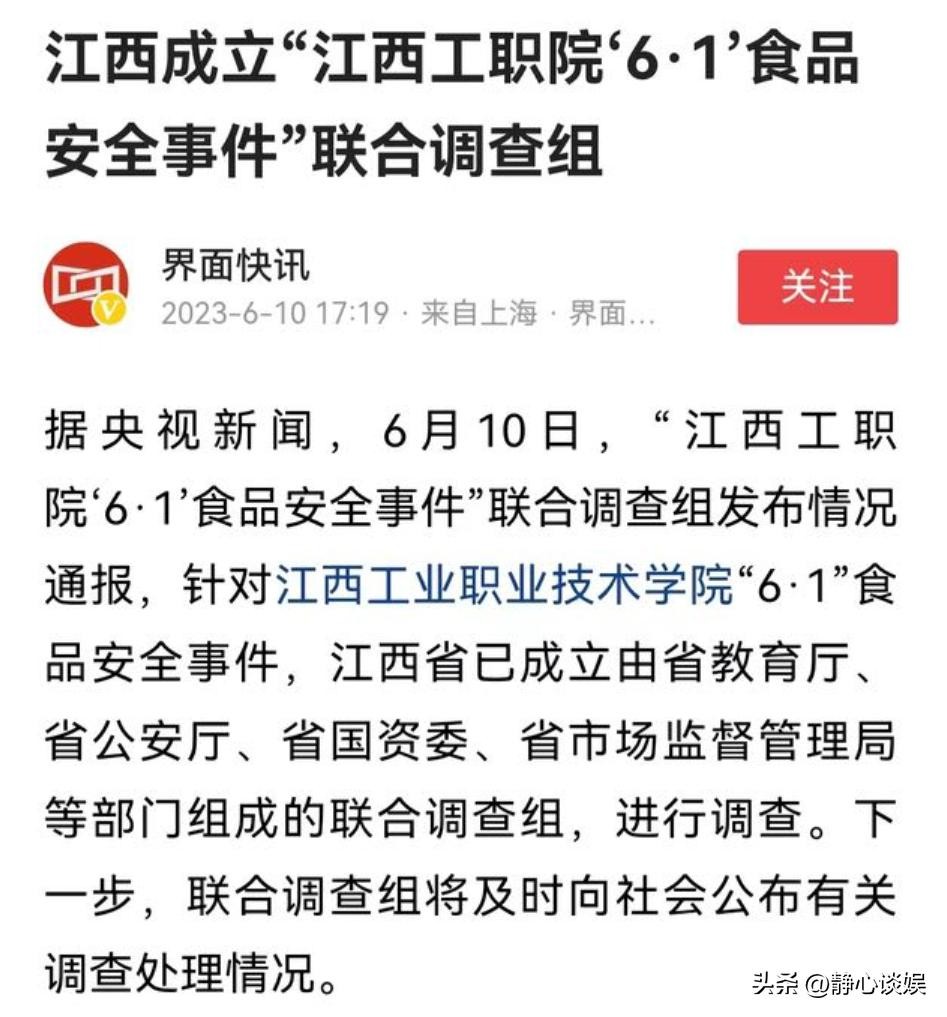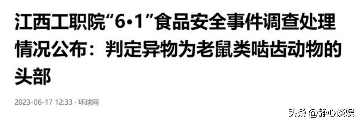 随后根据关于江西工职院食品安全事件调查的情况公布:判定异物为鼠类啮齿动物的头部。