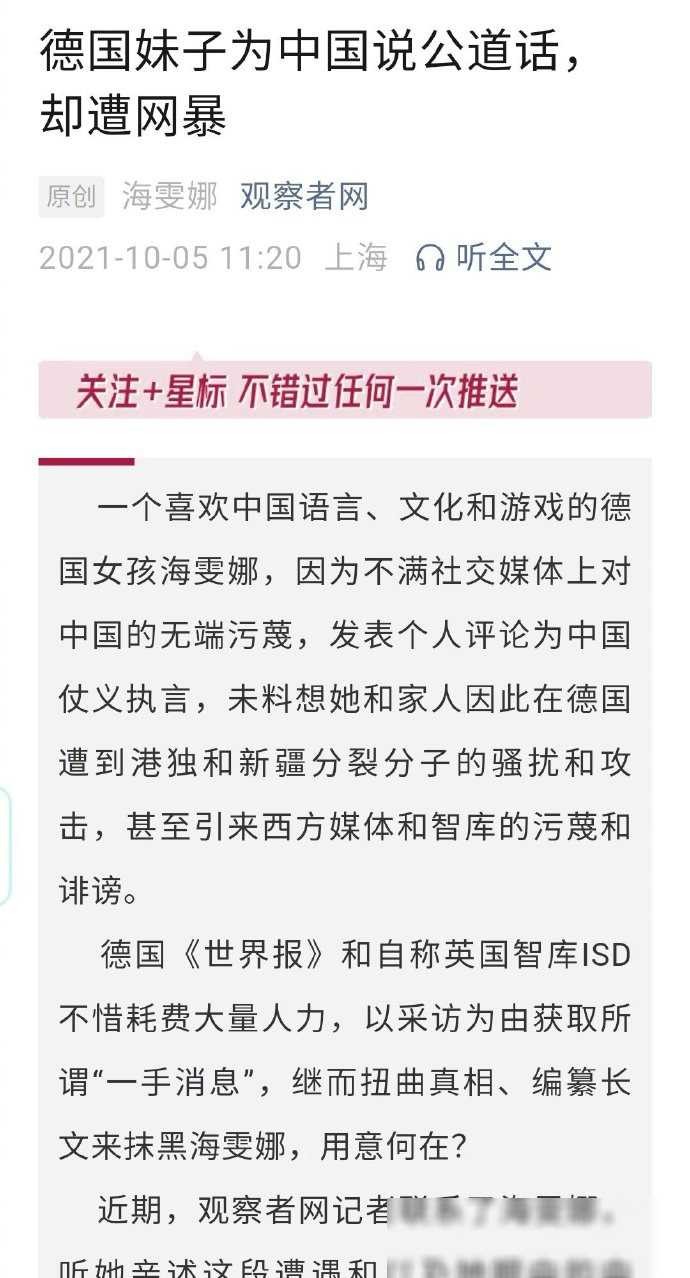 主体:生于2000年的海雯娜目前在中国青岛,据称与一名在德国留学的山东同乡相识相恋,婚后便随丈夫来此居住。自2021年以来,包括中国新闻社在内的多家国内媒体都曾报道过海雯娜在推特上的积极发言。