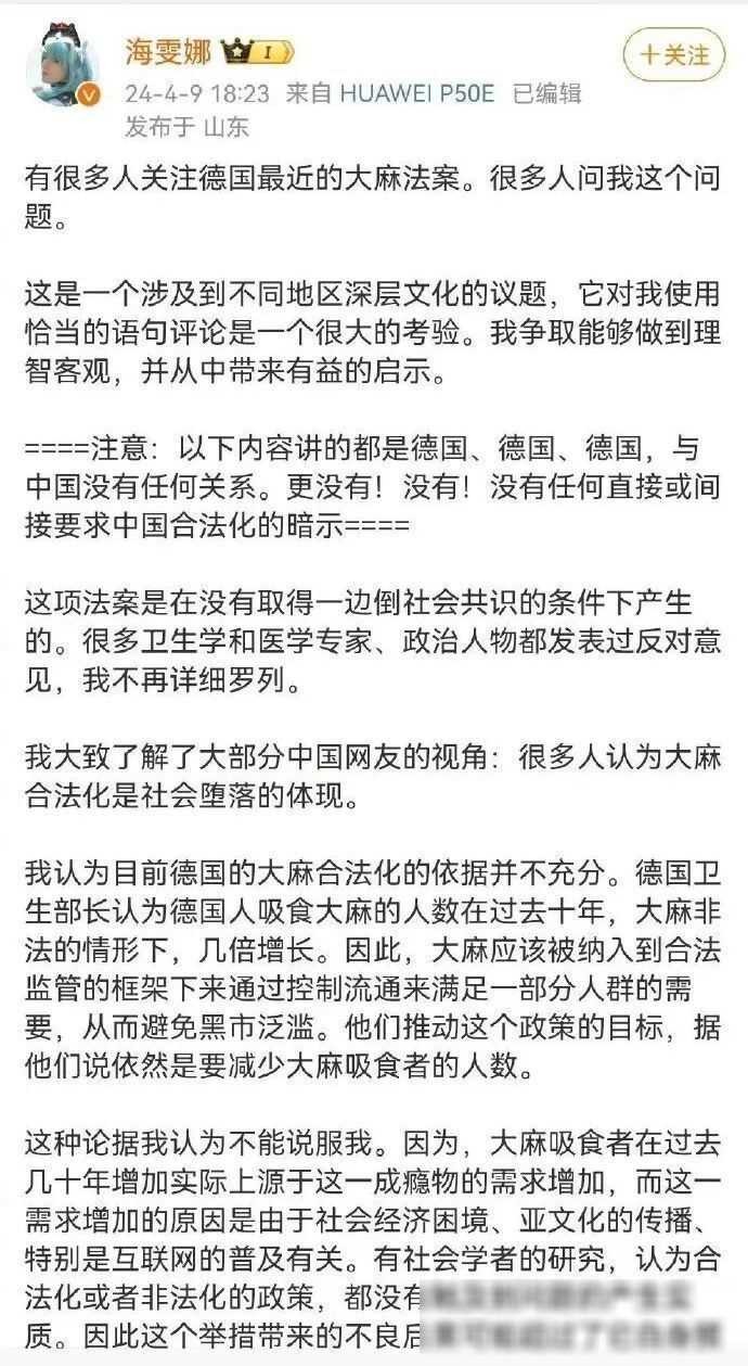 然而,海雯娜的观点却在中国社交媒体上引发了争议。本月9日,她发布了一篇关于德国大麻合法化的解读文章,引发了一些网友和大V的质疑,甚至有人指责她试图推动中国大麻合法化。