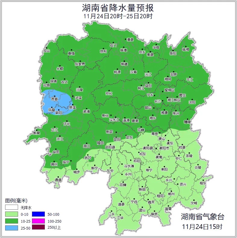 从全省范围来看,湖南省气象台预计,24日晚到25日,受高空槽、切变线和冷空气共同影响,湖南有一次降雨降温、风力加大的天气过程,最低气温降至4℃;26日至27日白天,受偏北气流控制,天气逐步转好。