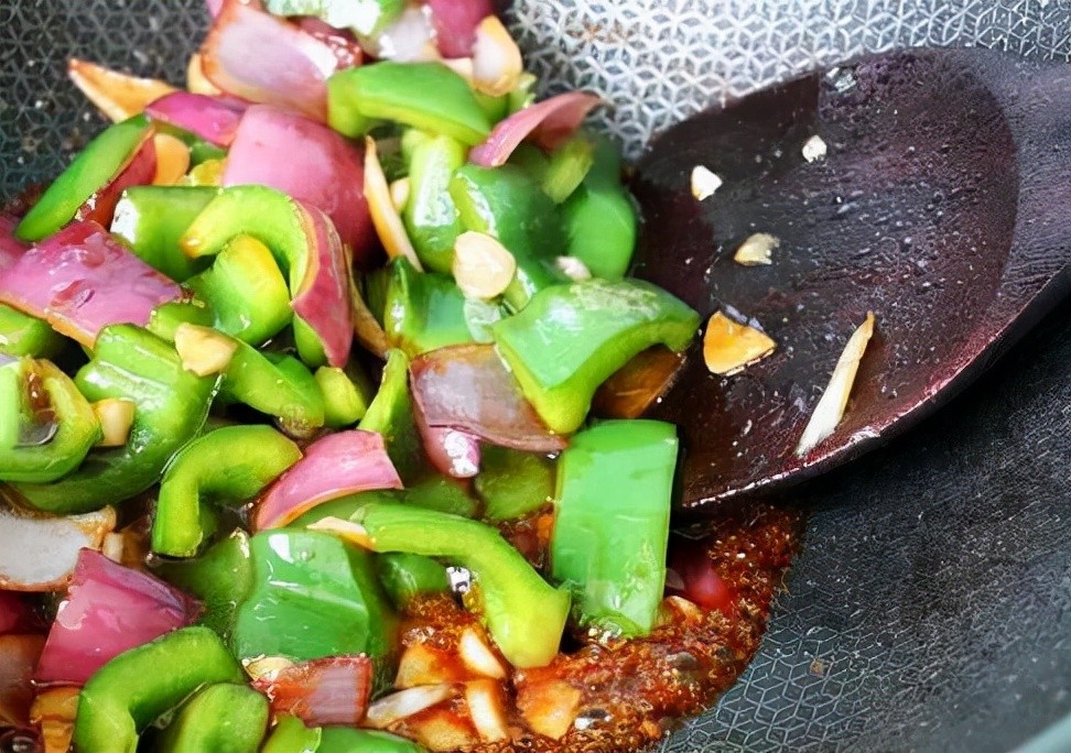 第五步:再把菜椒也放进来,翻炒一会,菜椒表面变软。