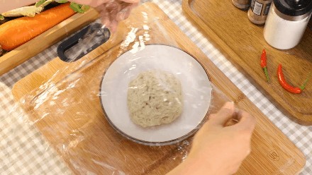 2. 揉好的面团放入碗中,盖上保鲜膜,醒面30分钟。
