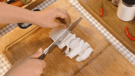 12. 将凉皮切成条状,蒸好的面筋切小块。