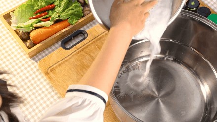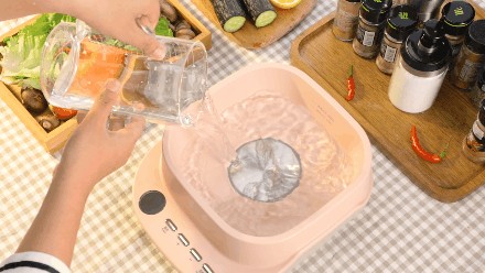 10. 肠粉机的底座中加水至最高水位线,蒸盘中刷油后,倒入2勺面浆,水开后放入蒸盘中,盖上盖子蒸5分钟。