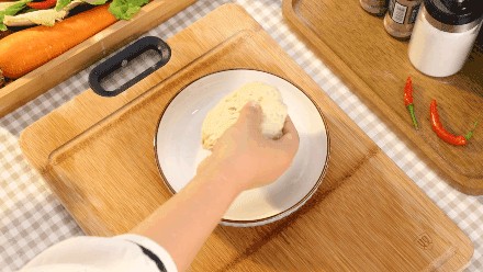 8. 洗出的面筋,加入酵母,放入盘中,简单揉搓一下,盖上保鲜膜,醒发半小时。
