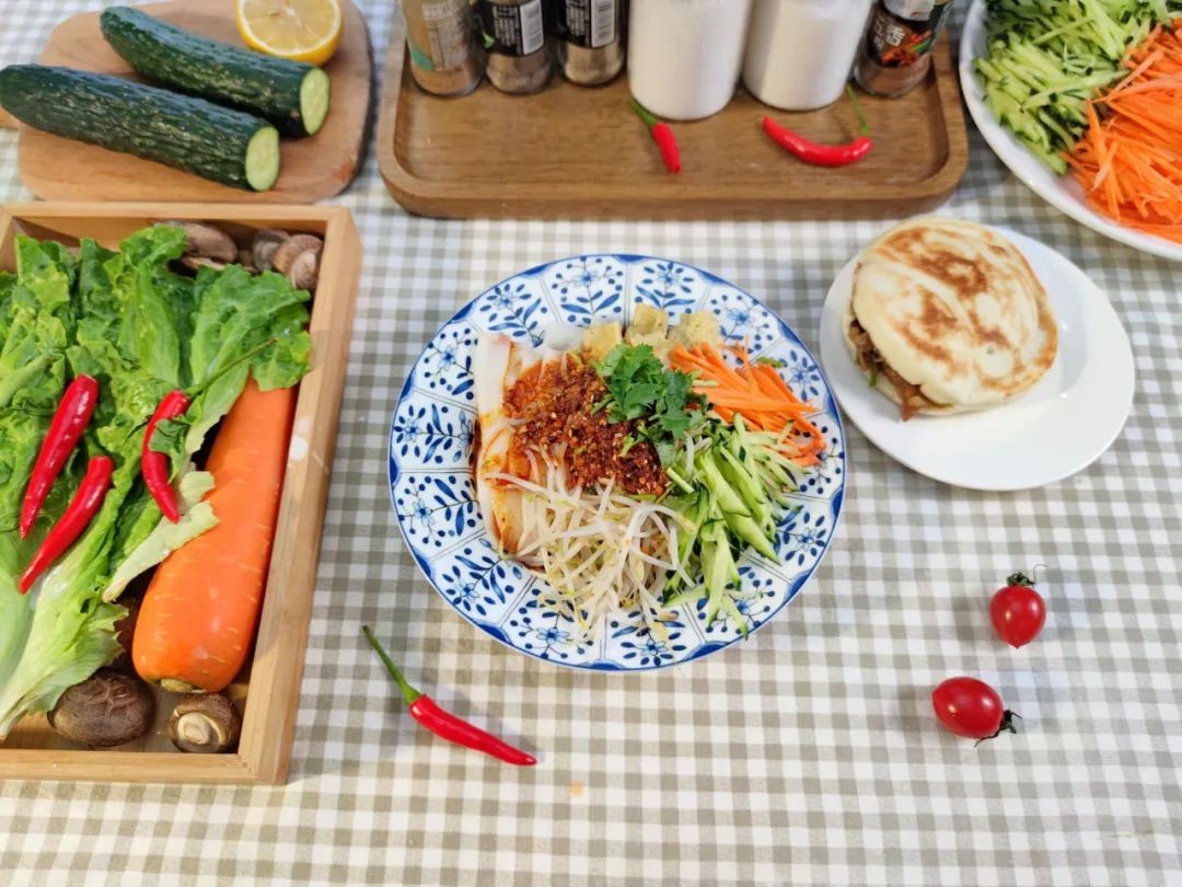 面筋、黄瓜丝、豆芽等配菜,爱放多少放多少,简直不要太满足!