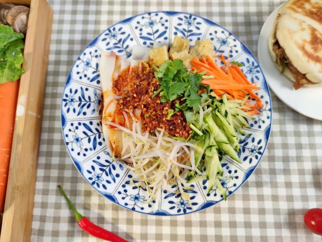 晶莹透亮的凉皮,撒上黄瓜丝、胡萝卜丝、豆芽、香菜碎,再浇上一大勺油泼辣子打底的料汁,搅拌均匀。