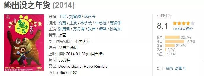 这是熊出没的贺岁片,是第一部电影,也是评分最高的一部。