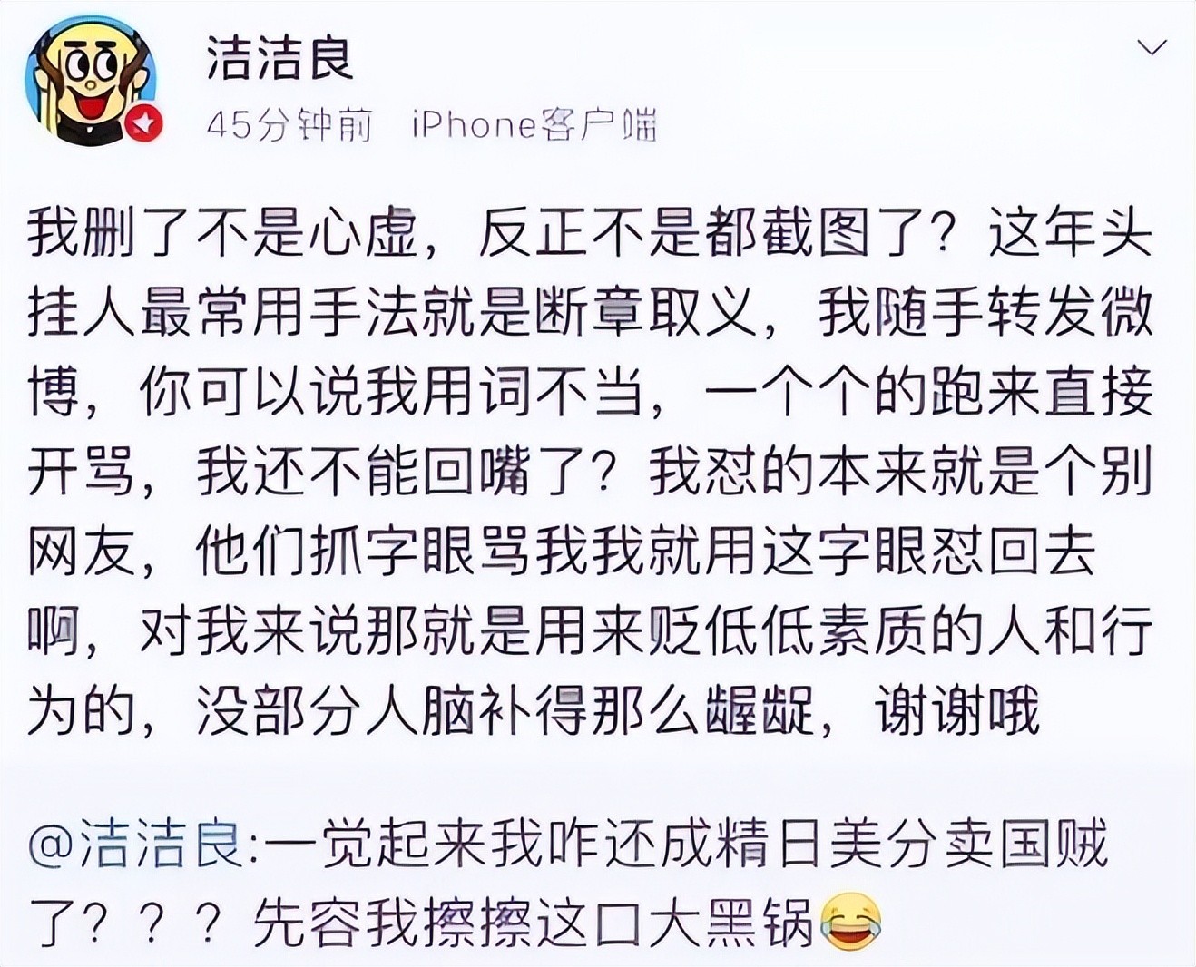 2018年,昵称为“洁洁良”的网友,公开在微博上发表了多条辱华言论。声称中国人为“支那人”、“粉红豚”等。