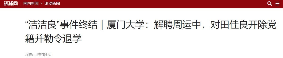 《“洁洁良”事件终结|厦门大学:解聘周运中,对田佳良开除党籍并勒令退学》
