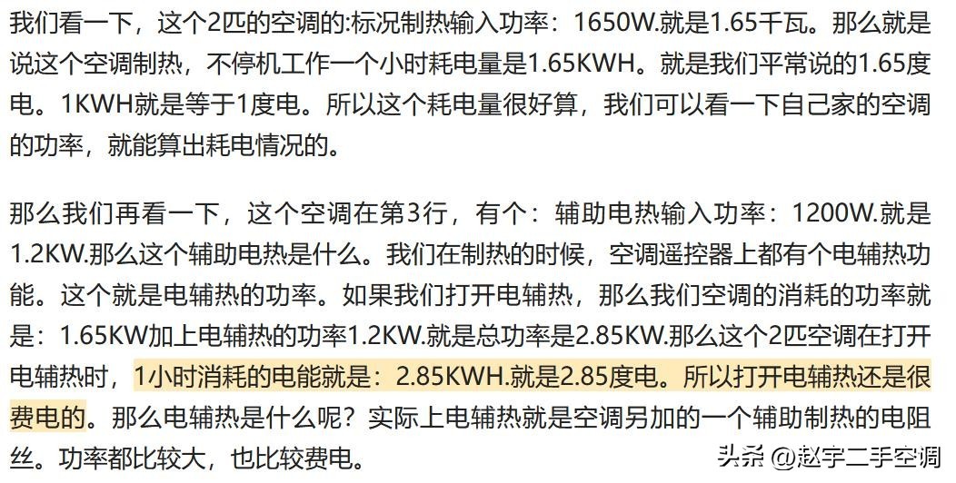 下面赵宇再以一个1匹空调的参数给大家算一下,这个1匹的空调在制热时,1小时要耗电多少度。这个是个1匹单冷空调的参数,我们可以看一下,这个机器没有制热时的功率。那么实际上空调制冷制热的功率是一样的。在没有电辅热的情况下。那么,我们是不是就能认定空调制冷和制热费电情况是一样的呢。实际上单从功率上来看,耗电是一样的。那么,我们为什么感觉制热更费电呢。是因为。空调制热的效率低于制冷。同时,空调的效率随着室外温度的下降,越来越低。就是室外温度越低。空调的制热效率越低。就是同样消耗1度电,产生的热量更少。