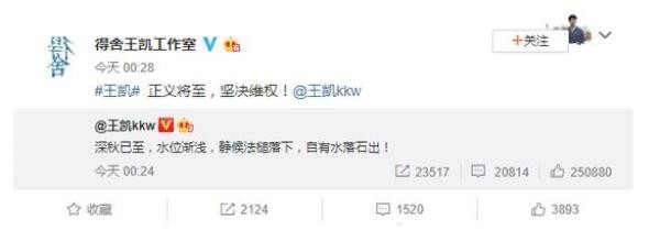 11月1日凌晨,也许是因为不堪谣言的困扰,被造谣了3年多后,王凯终于对此事做出回应,发文道:“深秋已至,水位渐浅,静候法槌落下,自有水落石出!”,随后王凯工作上也转发该微博,并表示要坚决维护权益。