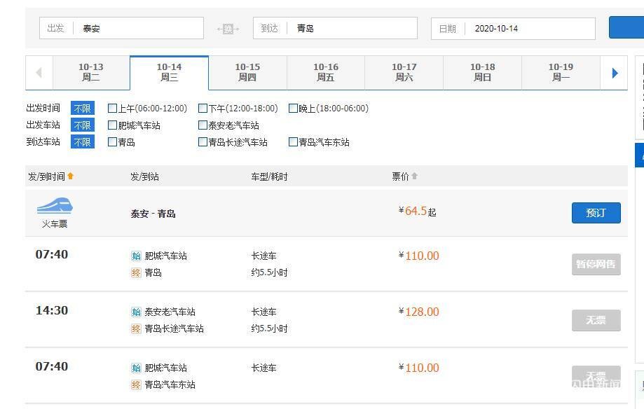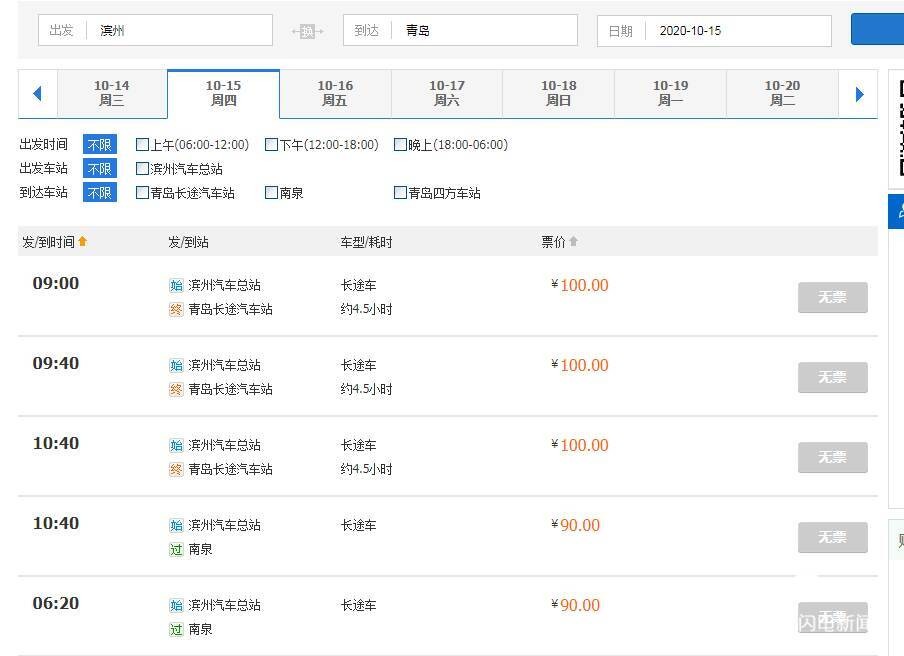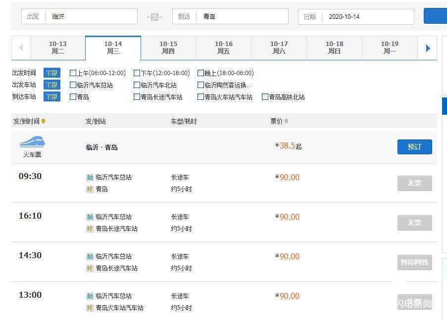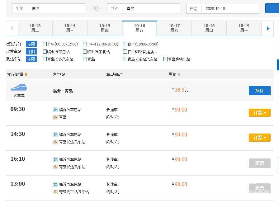 此外,临沂发往青岛的客运班车在10月14日、10月15日两天显示“无票”状态,从10月16日开始可以订票。