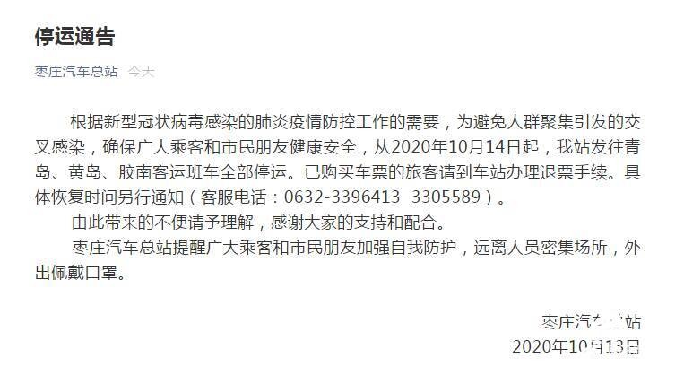 齐鲁网·闪电新闻10月13日讯 闪电新闻记者从济南莱芜区汽车总站、枣庄汽车总站官方公众号获悉,10月13日起,莱芜汽车总站发往青岛的客运班线暂时停运,10月14日起,枣庄发往青岛、黄岛、胶南方向的客运班车暂时停运,具体恢复时间另行通知。同时,为了保证乘客的出行安全,各长途客运站在疫情防控常态化的情况下也加强了防控举措。