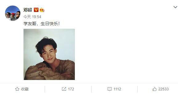 7月10日,邓超在个人社交平台晒出一张张学友年轻时候的帅气照为其庆生,并配文称:“学友哥,生日快乐! ”网友看到也纷纷送上了生日祝福。