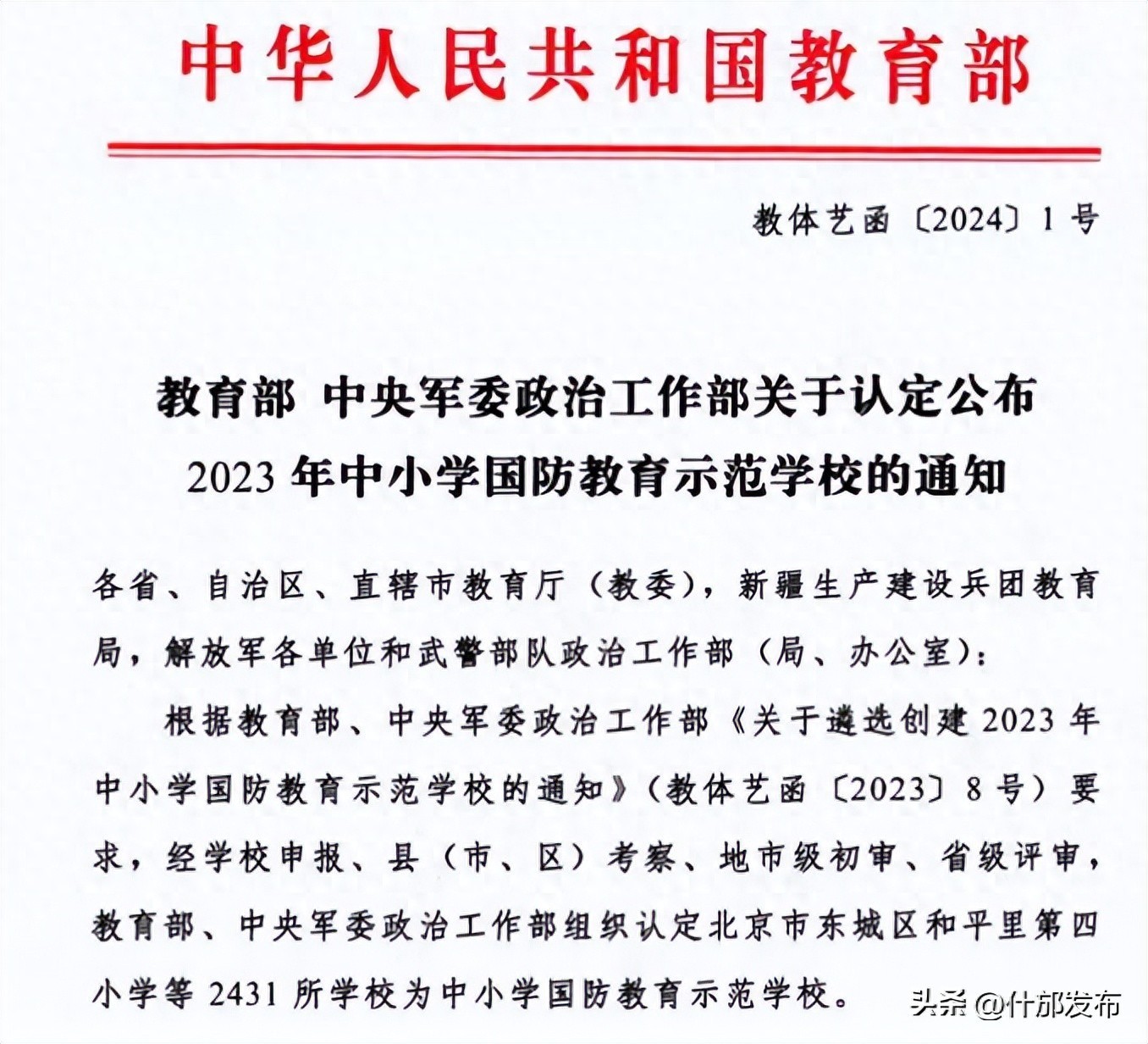 近日,教育部 中央军委政治工作部发出了《关于认定公布2023年中小学国防教育示范学校的通知》,什邡中学榜上有名!