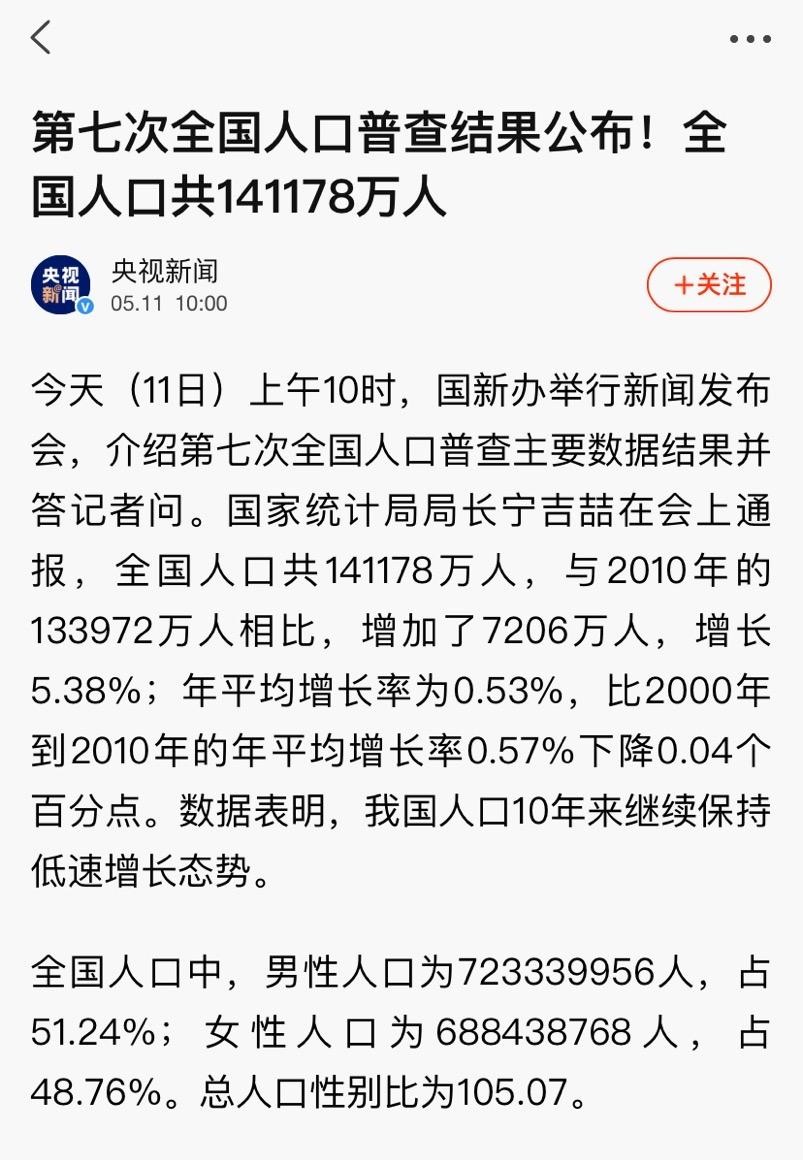 今天,第七次全国人口普查结果正式出炉!据公布数据显示,全国人口14.1亿人,对比2010年增长5.38%。