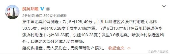 「成都区县事」今日邛崃连续发生两次地震 初步排查无人员伤亡
