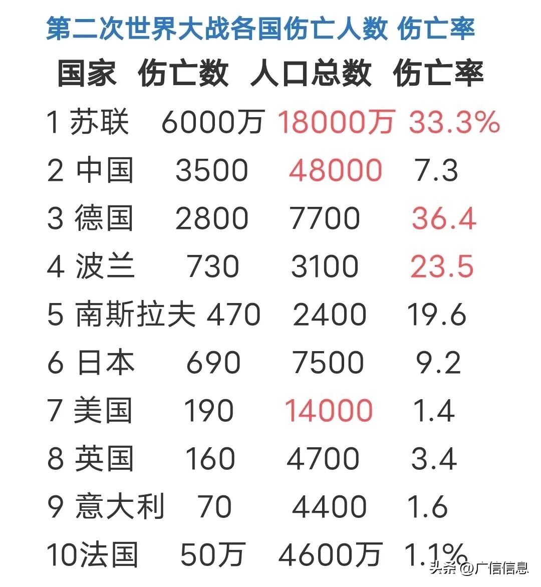 二战伤亡人数、伤亡率前十国家排列,前三是苏联、中国、德国