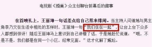 这六个字,瞬间让所有人以为他们真的在一起了,但实际只是李乃文跟王丽坤的房子都在同一个小区,进进出出,互相经常见面,就传出了绯闻。