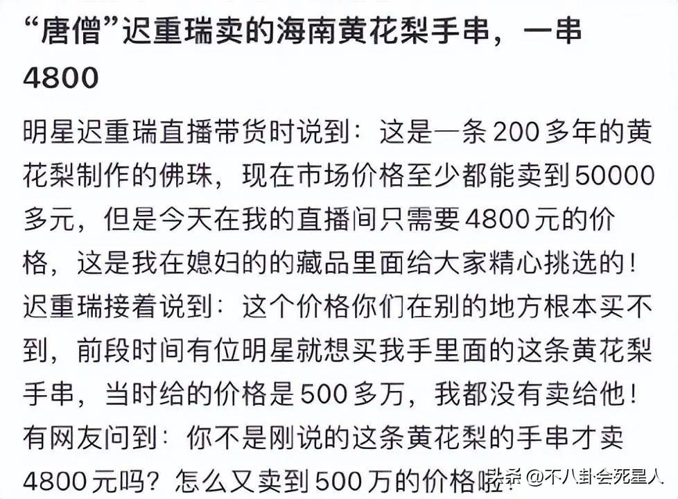 离谱的是,之后迟重瑞又说,之前有一位明星要跟他买手上的手串,开价竟然高达5百万,最后迟重瑞没有答应。有网友对迟重瑞在直播间说的手串价值表示怀疑,觉得他是宣传过大。