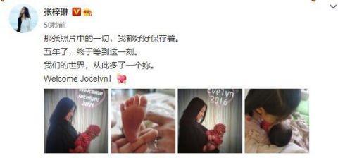6月1日儿童节,张梓琳在个人社交平台po出一组和二女儿的合照,并写道“五年了,终于等到这一刻。我们的世界,从此多了一个妳。”照片中,Jocelyn身穿条纹衣,呆萌可爱,躺在妈妈怀里与她对视的画面温馨有爱。