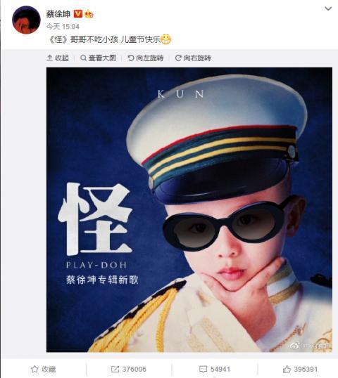 6月1日, 蔡徐坤在儿童节当天在个人社交平台上惊喜发布自己的新歌《怪》,并配文:“怪哥哥不吃小孩。”单曲封面为蔡徐坤儿时照片,儿时的他戴着墨镜和海军帽手比“对勾”,十分可爱。