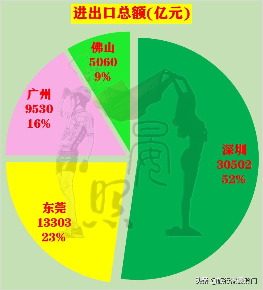 在进出口数据上,四座城市表现出来的结果刚好和距离香港的距离形成鲜明的正比例关系。紧邻国际贸易大都市香港的深圳,不仅是广州+东莞+佛山三座城市的总和还多,而且是广州的3.2倍,更是佛山的6.03倍。而省会城市广州不仅惨败给深圳,即便是和东莞相比,也仅有其的71.6%。这也充分说明了地理区位优势对于促进外贸发展的至关重要性。