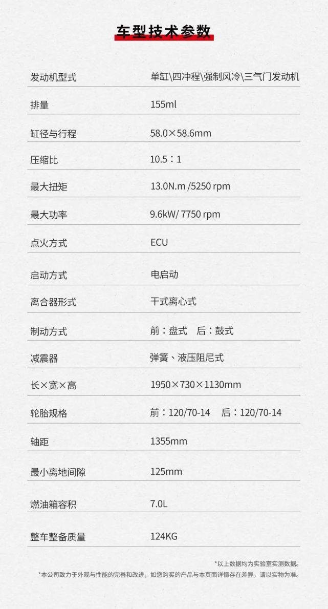 采用正置前叉和单侧置后减,刹车系统稍微对不起“运动”的定位,采用前碟后鼓的配置。油箱容积7L。轮胎采用前120/70-14,后120/70-14的组合方式。