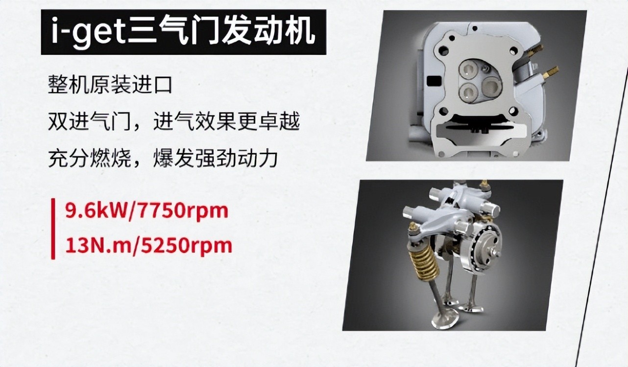 搭载的I-Get发动机,配气结构很有特色;采用2进气门1排气门的结构,现在来看是比较少见的,在当下也并不是什么高精尖的新技术。采用155cc单缸风冷发动机,SOHC3气门,缸径*行程 58*58.6,压缩比10.5:1;拥有最大功率9.6kw@7750rpm,最大扭矩13Nm@5250rpm的动力储备。